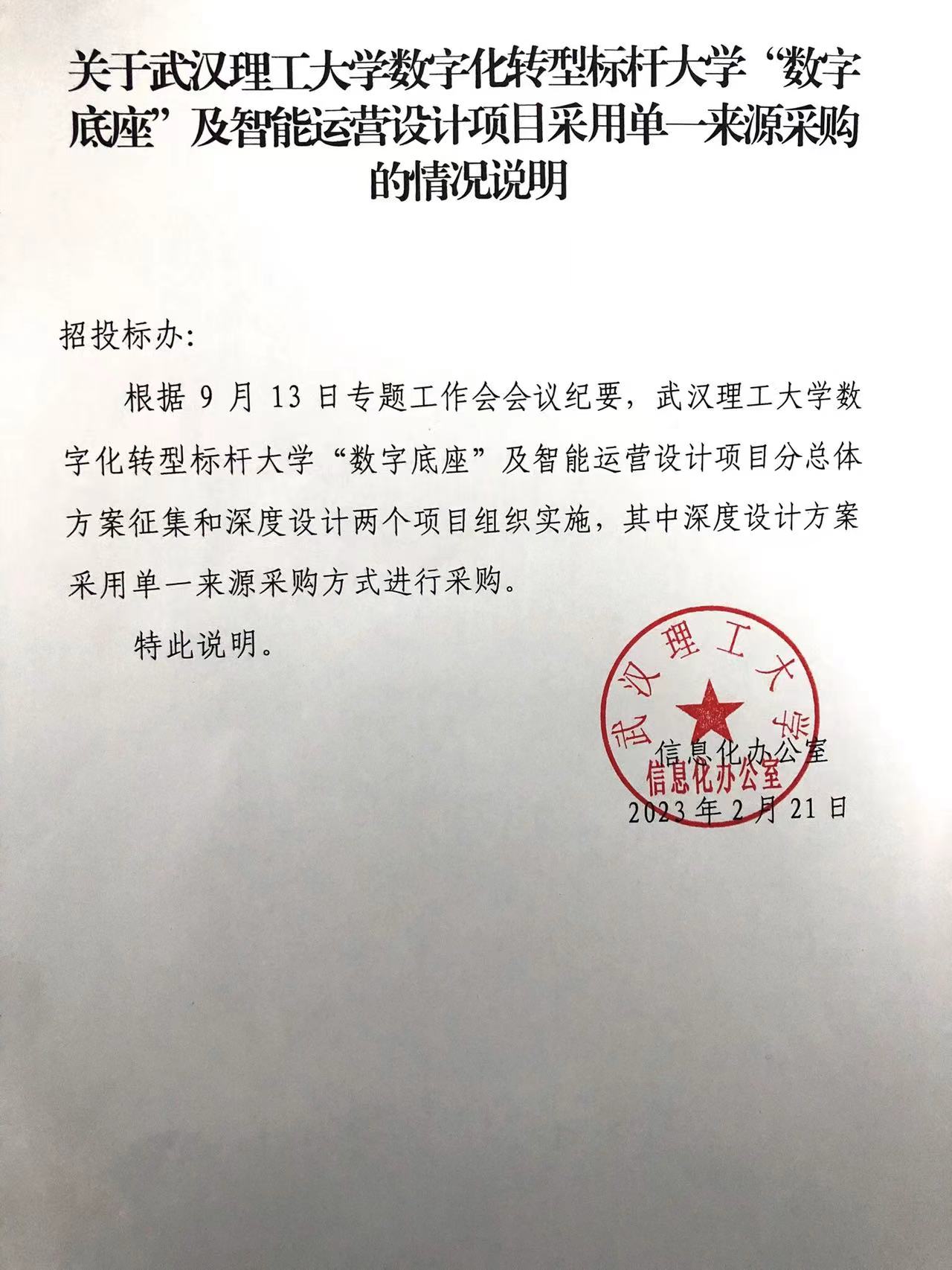 根据9月13日专题工作会会议纪要,武汉理工大学数字化转型标杆大学“数字底座”及智能运营设计项目分总体方案征集和深度设计两个项目组织实施,其中深度设计方案采用单一来源采购方式进行采购。总体方案设计是深度设计的技术工作前提和基础,两者具有高度承接性。总体方案征集已通过公开遴选的方式确定总体方案排序第一名的单位为中信建筑设计研究总院有限公司,本项目拟采用单一来源方式进行采购。